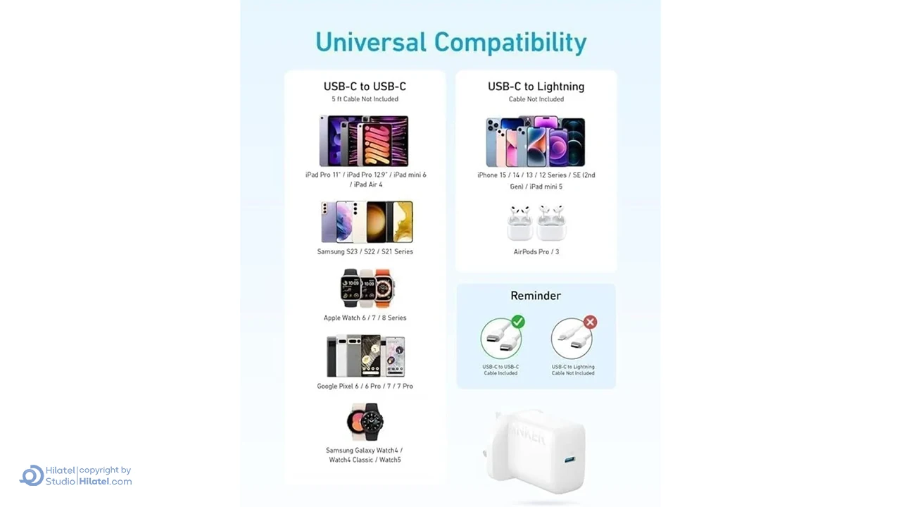 سازگاری وسعت با دستگاه‌های مختلف یکی دیگر از ویژگی‌های بارز شارژر انکر است. شارژر دیواری انکر Anker Select Charger 20W با کابل USB C مدل B2347 قادر است با بسیاری از گوشی‌های هوشمند، تبلت‌ها و سایر دستگاه‌های الکترونیکی که از پورت USB-C استفاده می‌کنند، سازگار شود. به همین دلیل، می‌توان به راحتی از آن برای شارژ دستگاه‌های مختلف استفاده کرد بدون نیاز به نگرانی در مورد سازگاری. این مساله به ویژه برای افرادی که چندین دستگاه دارند، بسیار مفید است.