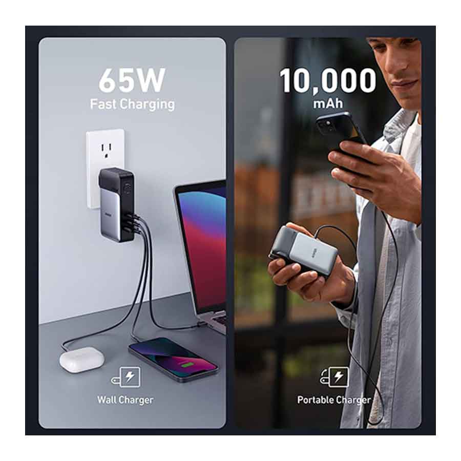 یکی از مهم‌ترین ویژگی‌های این محصول، ترکیب شارژر دیواری ۶۵ واتی با پاوربانک ۱۰۰۰۰ میلی‌آمپر است. این یعنی دیگر لازم نیست دو دستگاه جداگانه همراه خود داشته باشید.
